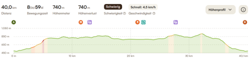 Höhenprofil (485 m bis 920 m), Gesamtanstieg ca. 740 m